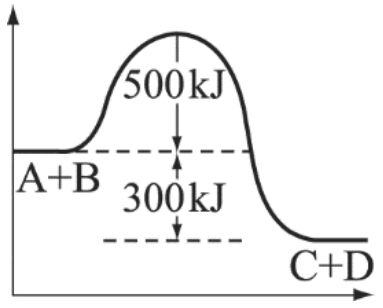10.右圖為 A+B→C+D 反應的熱含量變化圖,ΔH 表示其反應熱,則下列敘述何者正確?(A)ΔH=+500 kJ(B)ΔH=-500 kJ(C)ΔH=+300 kJ(D)ΔH=-300 kJ。