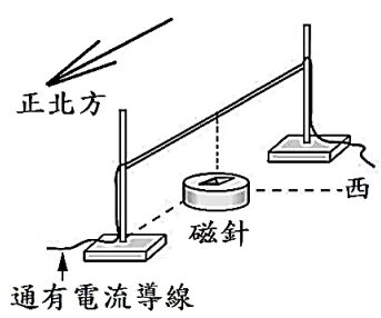 26. 如右圖所示,有一水平放置之長直導線,在導線正下方放置一個磁針,在導線上通以由北向南方向的電流時,磁針產生小偏轉,若要增加磁針偏轉角度, 請問以下方法中,何者正確?(A) 減少導線上的電流大小 (B) 改變導線上的電流方向 (C) 磁針鉛直向上移動 (D) 磁針水平向西移動。