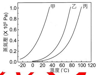 40. 已知乙醇、乙醚、水的蒸氣壓曲線如下圖所示,則蒸氣壓曲線甲、乙、 丙與各化合物的配對,下列哪一選項的組合完全正確?