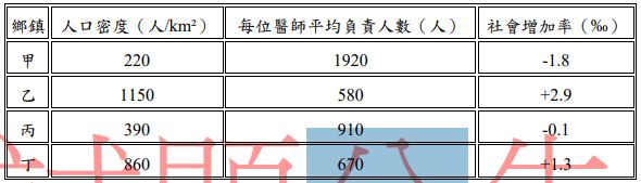 41. 某行政區政府推動「高齡友善社區」計畫,試圖改善當地部分鄉鎮醫療與交通服務不足、人口老化加劇、農村青年人口外移的困境,並強化社會照護系統與鄰里支持網絡。下表為該行政區內幾個鄉鎮的統計資料,請判斷下列哪個鄉鎮最可能為該計畫的優先推動區?(A)甲 (B)乙(C)丙 (D)丁