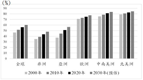 45. 下圖是聯合國2020年發表某項數據的變化與預估資料,此圖主題最可能為下列何者? (A)平均壽命 (B)經濟成長率 (C)人口成長率 (D)都市化程度