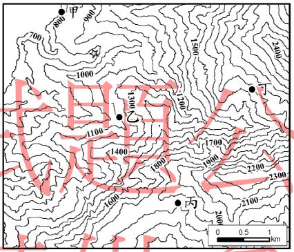 48. 下圖為等高線地形圖,圖中星號為某橋梁,甲、乙、丙、丁為大型崩塌地的位置,為保護橋梁,避免受到土石流破壞。哪一個崩塌地最需要監測或治理? (A)甲 (B)乙 (C)丙 (D)丁