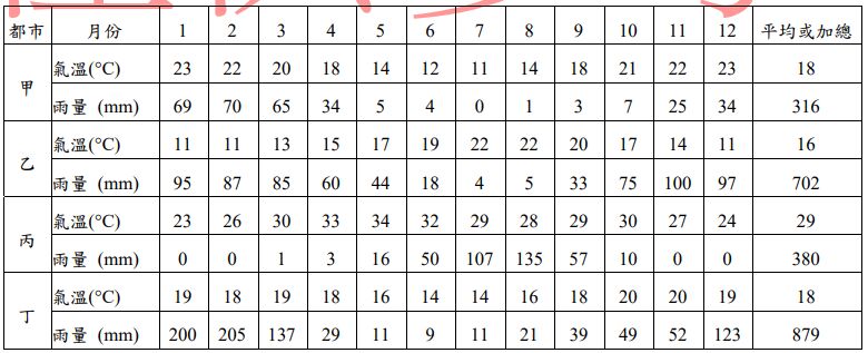 49. 下表為全球四個都市的降雨和氣溫資料,下列哪個都市最可能位於沙黑爾(Sahel)地區?(A)甲 (B)乙 (C)丙 (D)丁