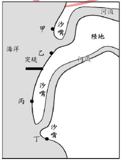 53. 下圖為某地的河口和海岸線。突堤興建後,最可能對圖中何處造成嚴重的海岸侵蝕?(A)甲 (B)乙 (C)丙 (D)丁