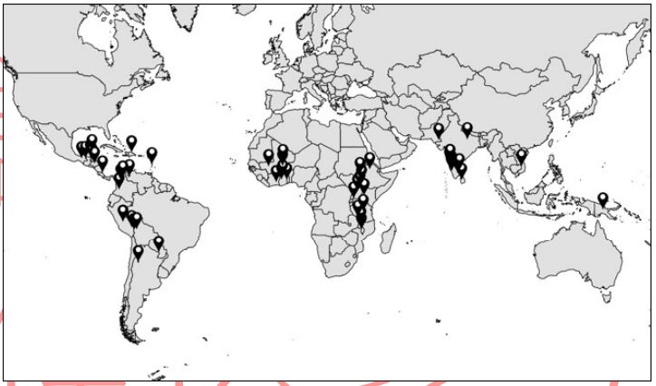 71. 下圖是參與某制度的生產商分布,觀察此圖推論此制度最可能是下列何者?(A)永續林業管理(FSC)制度(B)公平貿易(Fair Trade)認證制度(C)世界貿易組織(WTO)成員制度(D)有機農業歐盟標章(EU Organic)制度