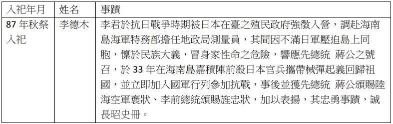 二、臺北市忠烈祠是大直高中附近的地標,內有許多為國犧牲的忠烈人士入祀,以下是一位入祀者的資料。請利用這份資料,設計一份探究與實作的教案,內容包括:(1)預定探究的主題方向(2)如何引導學生發現預定探究主題方向(3)設計此一教案的想法