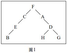 1. 請問根據此二元樹(圖1)進行「前序走訪(Pre-Order Traversal)」時,以下何者順序正確? (A) BECFAHDG (B) FCEBADHG (C) BECHGDAF (D) FCAEDBHG