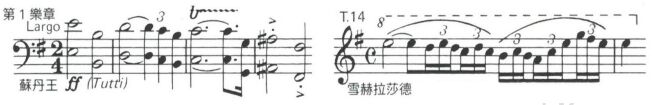 5. 下列旋律出自於李姆斯基—柯薩科夫 (N. Rimsky-Korsakov) 的管弦樂作品《天方夜譚》(Sheherazade),該作品運用不同的音樂語彙展現主角獨特性格,如有力的八度代表蘇丹王,女主角雪赫拉莎德則以悠揚的曲調展現其溫柔動人的形象,請問譜例中雪赫拉莎德的獨奏片段最可能由下列何種樂器演奏? (A) 低音提琴 (B) 大提琴 (C) 中提琴 (D) 小提琴