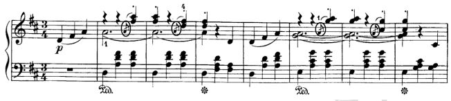 8. 承上題,除輕歌劇以外,約翰・史特勞斯二世也創作了許多由管弦樂團演奏的圓舞曲,十分受到當時維也納社交圈的推崇,因此有著「圓舞曲之王」的稱號。下列鋼琴譜例是改編自他的哪一首作品?(A) 《藍色多瑙河》(An der schönen blauen Donau) (B) 《皇帝圓舞曲》(Kaiser-Walzer) (C) 《維也納森林的故事》(Geschichten aus dem Wienerwald) (D) 《春之聲》(Frühlingsstimmen)