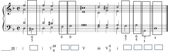 (二)請標示調性,並依數字低音於聲部空缺處填入適當級數與四部和聲進行,將正確答案填入答案卷內