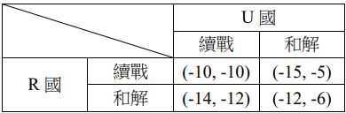 8 假設R國與U國正在進行戰爭,兩國分別可以採用的策略為:繼續戰爭(續戰)及和解。下表為兩國的賽局報酬矩陣(payoffmatrix),括號內數值依序為R國的報酬、U國的報酬,則Nash均衡為何?(A)R國採取和解,U國採取續戰(B)R國採取續戰,U國採取和解(C)兩國都採取和解(D)Nash均衡不存在