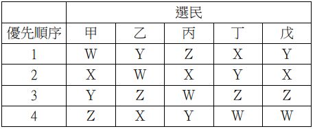 10. 考慮淘汰票決制,每一輪選民針對選擇方案最不青睞的方案投不同意,將最多不同意的方案去除,重複進行直到最後只剩下一個選擇方案為止。假設有甲、乙、丙、丁、戊五位選民,對W、X、Y、Z四個方案的偏好評比如表所示。假定所有選民的方案偏好順序,在各輪的投票維持不變,則淘汰票決制下會選出那一個方案?(A)W(B)X(C)Y(D)Z