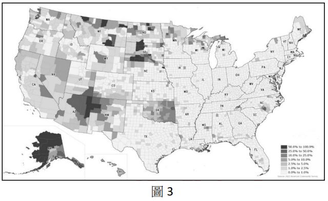 43.圖 3 為美國以郡(county)為統計單位的主題地圖,顏色愈深代表數量愈大。該圖的主題最可能是下列何者?(A)美國原住民族人口分布圖 (B)美國西班牙裔移民分布圖(C)美國野火事件發生機率圖 (D)美國水患事件發生機率圖