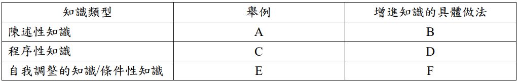 2.人類長期記憶中的知識分為陳述性知識(declarativeknowledge)、程序性知識(proceduralknowledge)、及自我調整的知識(self-regulatoryknowledge)/條件性知識(conditionalknowledge)。舉例說明這三種知識並提出可增進該種知識的具體做法。