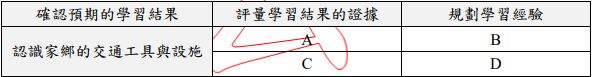 1.吳老師運用逆向設計法(backward design)規劃「家鄉的交通」主題課程,希望讓學生 認識家鄉交通與居民生活之間的關係。表中為其中一項預期的學習結果,試據此 決定兩項評量此學習結果的證據,並規劃對應的學習經驗(在答案卷中標註 A、B、C、 D,並分別寫出答案)。