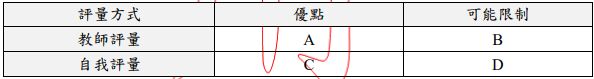 (1)情境中由教師或學生以評分規準進行寫作評量,試分別寫出一項優點與可能限制 (在答案卷中標註 A、B、C、D,並分別寫出答案)。