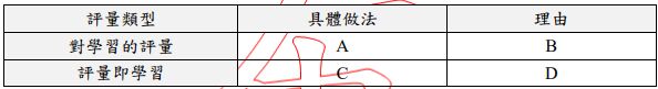 6.試從活動二、活動三與活動四的歷程中,找出王老師運用「對學習的評量」(assessment of learning)和「評量即學習」(assessment as learning)的具體做法,並說明理由 (在答案卷中標註 A、B、C、D,並分別寫出答案)。