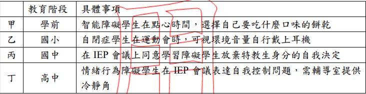 10.以下各教育階段身心障礙學生的「自我決策」與「自我倡議」具體事項,哪些較適切?