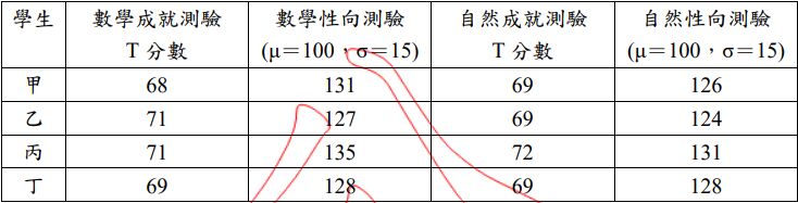 16.表格為數理資優班甄試的測驗結果,依據現行特殊教育法規,哪一位學生較可能無法通過學術性向資賦優異鑑定?