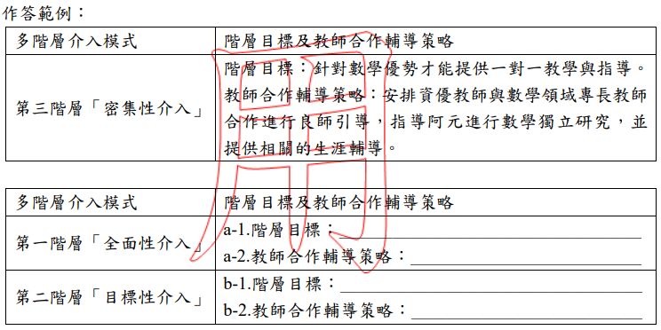 2.阿元為國小五年級自閉症資優學生,喜歡且擅長數學,圖形推理能力及空間概念良好,但對沒有興趣的領域學科容易分心。他也面臨社交困難及情緒管理問題,影響課堂學習與人際互動。學校設有資優資源班及身心障礙資源班,針對阿元的學習及輔導需求,依據結合介入反應(RTI)發展的「多階層介入模式」,分別針對第一階層「全面性介入」及第二階層「目標性介入」各寫出一項目標,以及對應該階層目標的教師合作輔導策略
