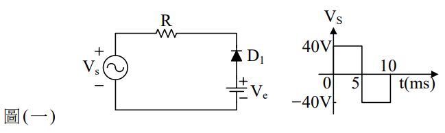 7. 圖(一)為一外加交流電壓Vs的截波電路( clipping circuit),直流電壓Ve為20V,二極體峰值為40mA電流限制,則平均二極體電流值ID1為何? (A) 10mA (B) 20mA (C) 30mA (D) 5mA
