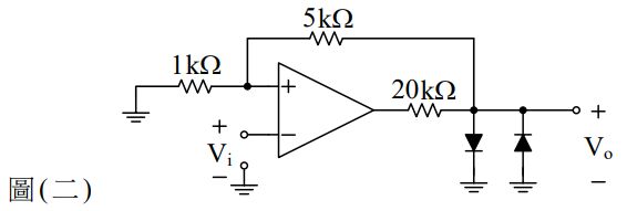 8. 圖(二)為運算放大器電路,當二極體導通時電壓為0.6V,運算放大器飽和電壓為± 5V, 則二極體最大電流為何?(A) 1.52mA (B) 0.42mA (C) 0.12mA (D) 0.62mA