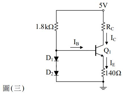 9. 圖(三)為二極體與電晶體所組成的電路,二極體D1與D2的導通電壓為0.7V,電晶體Q1導通的VBE電壓為0.7V,電流增益 β=100,若電晶體Q1操作在主動區,VCE須大於0.3V, 則流過二極體D1與D2的直流電流為何? (A) 1.52mA (B) 0.67mA (C) 9.21mA (D) 1.95mA