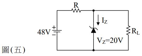 11. 圖(五)中電路的負載電阻RL =20 kΩ,希望設計IZ電流為9mA,則電阻R為何?(A) 1.2 kΩ(B) 2.8 kΩ(C) 3.6 kΩ(D) 4.8 kΩ