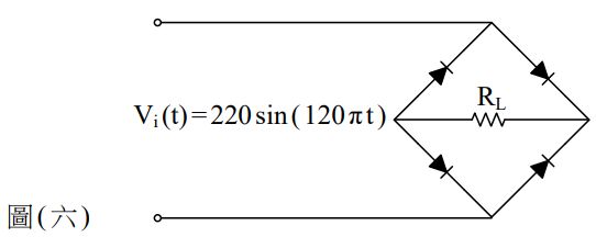 12. 圖(六)為二極體橋式整流器,輸入交流電源Vi(t)=220sin(120πt),求RL電阻兩端之輸出電壓平均值?(A) 110.10V(B) 210.45V(C) 140.05V(D) 86.52V