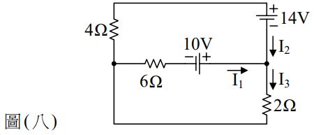 14. 圖(八)為電阻與電源之串並聯組合的直流電路,求電流I1為何?(A) 2A(B) – 2A(C) 1A(D) – 1A