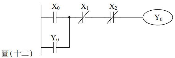24. 如圖(十二)所示,X0和X1分別為啟動與停止按鈕,X2為熱繼電器,Y0為程序的輸出, 下列何者錯誤? (A) 這是停止優先程序(B) 是非自鎖電路 (C) 按下X1,Y0停止 (D) 按下X2,Y0停止