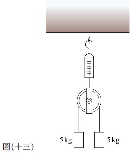 25. 有一個平衡的機械系統,如圖(十三)所示,則此時的彈簧刻度讀值?(A) 98N(B) 88N(C) 78N(D) 68N