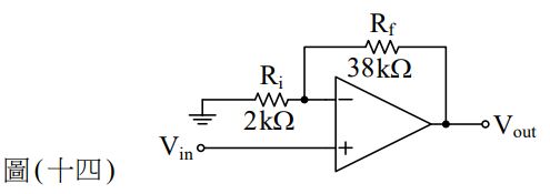 31. 如圖(十四)所示,下列敘述何者正確?(A) 為一非反相放大器,放大增益值為20(B) 為一反相放大器,放大增益值為– 20(C) 為一反相放大器,放大增益值為– 19(D) 為一非反相放大器,放大增益值為38