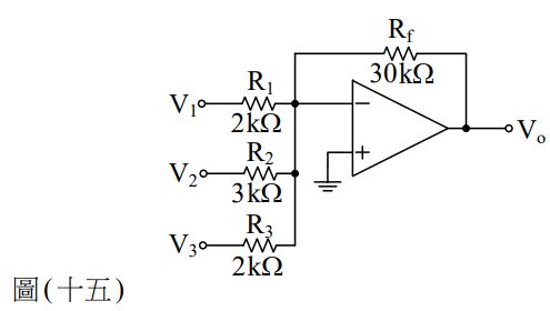 32. 如圖(十五)所示,若Rf=30kΩ、R1及R3=2kΩ、R2=3kΩ,當V1=3V、V2=3V、V3=5V時,則Vo為何?(A) 120V(B) – 150V(C) – 180V(D) – 200V