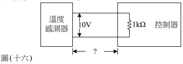 33. 如圖(十六)電壓電纜線佈置所示,使用美國電線規格AWG#20的電線連接溫度感測器與控制器,溫度感測器輸出電壓範圍為0至10V,控制器的輸入電阻為1 kΩ,若電線上最大電壓降為0.0404V,已知電線的電阻為4.06Ω,則溫度感測器與控制器兩者相距為何? (提示:AWG#20電線的電阻規格是10.15Ω/1000 ft)(A) 200 ft(B) 150 ft (C) 100 ft (D) 50 ft