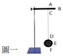 6. 在單擺實驗中,擺長是由一條繩線的末端繫上一個具有質量的擺錘所組成,如圖一,擺長的上端繩線綁在橫桿上,假設綁在橫桿上面的點為 A,橫桿中心 的點為 B,橫桿下面的點為 C,繩線下端綁在質量均勻的擺錘上面,在擺錘上面的點為 D,在擺錘中心的點為 E,在擺錘下面的點為 F,其單擺以小角度擺動的週期,ℓ為擺長長度,g 為擺錘所受到的重力加速度,擺錘質量為 M; 請問正確的擺長長度應如何測量? (A) A 到 D (B) C 到 D (C) C 到 E (D) C 到 F