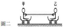 7. 甲、乙兩人的質量分別為 50 kg 及 90 kg,兩人坐在水平地面的滑板車上, 同時互拉,如圖二所示。假設滑板車的質量、滑板車與地面的摩擦力均忽略不計,則甲與乙的加速度值之比,下列何者正確? (A) 9:5 (B) 81:25 (C) 25:81 (D) 5:9。
