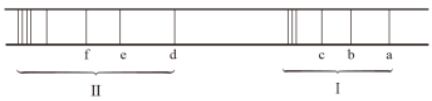22. 下圖為氫原子光譜之部分光譜,已知 b 譜線的波長為 540 nm。試問下列哪些敘述正確?(A)第 I 區是可見光區,第 II 區是紅外光區(B)a~f 譜線的頻率大小順序是 a < b < c < d < e < f(C)e 譜線與 d 譜線的能量差等同於 a 譜線的能量(D)f 譜線躍遷是從 n = 4 降落至 n = 2(E) 巴耳末系列第三條譜線是從 n = 5 降落至 n = 2。
