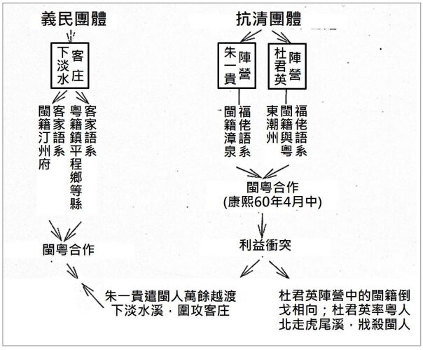 (二)試以「閩、粵」、「福、客」或「閩、客」等概念分析朱一貴事件發展過程。(24 分)參考資料:朱一貴事件中的族群關係