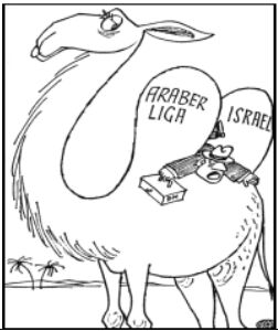 四、試題解析:下題為民國 90 年學測第 38 題,請指出其正確答案並加以解析。(10 分)右圖是一幅漫畫,描繪西方人眼中 1960 年代的世局。根據歷史知識,這幅漫畫冠上怎樣的標題最恰當?(A)阿拉伯與以色列爭執,使德國陷於兩難(B)石油危機爆發,西方工業發展受到重挫(C)美國利用以阿衝突時機,謀取自身利益(D)阿拉伯與以色列合作,來聯手對抗英國