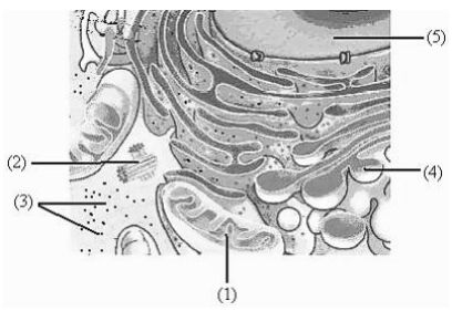 1.下圖為某細胞的部分顯微結構圖,下列有關該細胞的敘述何者正確?(A)這不是被子植物的細胞(B)結構1和4的膜可以通過“出芽”形式互相轉移(C)若該細胞為神經細胞,則不會含大量的結構4(D)在結構1、3、5中,都具有含鹼基互補配對的分子(E)結構2在具分裂能力的細胞中,可進行複製。