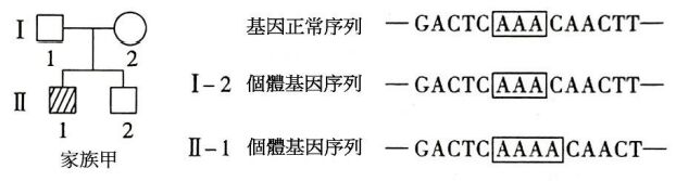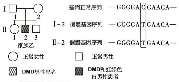 10.裘馨氏肌肉失養症(DuchenneMuscularDystrophy,DMD)是由X染色體單基因突變引起的隱性遺傳疾病,人群中男性發病率約為1/4000。附圖甲、乙兩家族中兩患者的外祖父均表現正常,家族乙Ⅱ-2還患有紅綠色盲。兩家族部分成員DMD基因測序結果(顯示部分序列,其他未顯示序列均正常)如圖所示。下列敘述哪些正確?(A)家族甲Ⅱ-1和家族乙Ⅱ-2分別遺傳其母親的DMD致病基因(B)若家族乙I-1和I-2再生育一個兒子,兒子患兩種病的機率為1/2(C)若家族乙I-1和I-2再生育一個兒子,兒子患兩種病的機率比只患一種病的機率低(D)不考慮其他突變,家族甲Ⅱ-2和家族乙Ⅱ-1婚後生出患DMD兒子的機率為1/8(E)人群中女性DMD患者頻率遠低於男性,而女性中攜帶者的頻率約為1/2000。