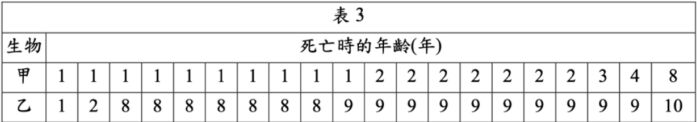 37.若下表為甲、乙兩種動物的20隻新生個體死亡年齡統計表,而8年、10年分別為甲、乙兩種動物的最長壽年齡,請據此判斷甲、乙分別為上圖生存曲線中的何種生物?