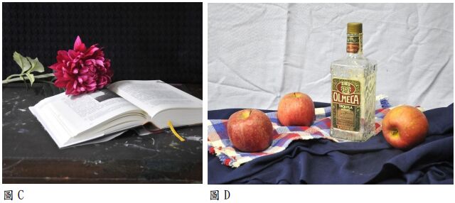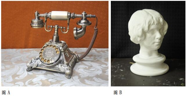 試題】靜謐日常【說明】一、請以圖 A 或圖 B 為主題,完成一件素描作品。二、下面四張圖片,有電話、石膏像、花、書本、酒瓶、蘋果、桌布共 7 種物件,皆須入畫,其中物件數量、光影、位置、方向、比例可依需求予以增減或改變。但是不得添加試題以外之物件。三、請以寫實技法呈現。限單色手繪,且為現場能夠乾燥固著之媒材。