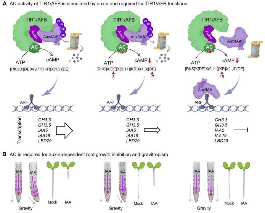 Adenylate cyclase activity of TIR1/AFB links cAMP to auxin-dependent responses The phytohormone auxin is essential for plant growth and development as well as cellular and systemic responses to environmental cues. The auxin receptor TRANSPORT INHIBITOR RESPONSE 1/AUXIN-SIGNALING F-BOX (TIR1/AFB) lies within an E3 ubiquitin ligase complex (SCFTIR1/AFB) consisting of Skp, Cullin, and F-box proteins. Auxin brings together TIR1/AFB and the transcriptional repressor Auxin/INDOLE-3-ACETIC ACID (Aux/IAA), which allows the SCFTIR1/AFB complex to transfer activated ubiquitin to Aux/IAA, thereby targeting it for proteasomal degradation. This liberates the transcription factors AUXIN-RESPONSE FACTORs for auxin-dependent transcription. Just when we thought that the major components in the auxin signaling pathway had been identified, an adenylate cyclase (AC), embedded in the TIR1/AFB receptors, has emerged as an essential component of auxin signaling in gravitropism and root growth inhibition (Figure 1). The product of the AC, 3′,5′-cyclic adenosine monophosphate (cAMP) could also mediate effects of auxin, especially in fastgrowing cells at the apical meristems or in polarized tip growth of pollen tubes, plausibly via the modulation of Ca2+ and changes in the actin cytoskeleton.