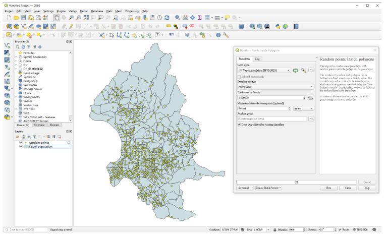 (一)阿湖把臺北市各里人口的shp.檔匯入QGIS,並進行屬性表的計算,但在加入點子圖後,卻沒有產生預期中的圖層(如下圖所示)。請問應如何修正才能產出人口點子圖層?
