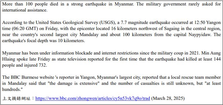 (一)請以下則國際新聞為例,從高三複習課程設計的角度,建構學生對該國的空間概念,說明為何災情嚴重、救災困難。