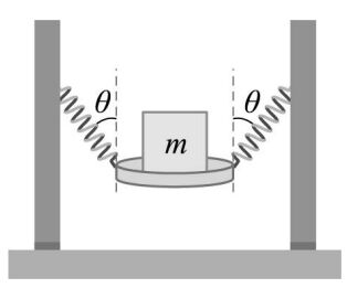 19. 製作一對完全相同的強力理想彈簧所構成可垂直彈射之投射裝置,如圖所示,設 g 為重力加速度,彈 簧的彈性常數為 k。若質量為 m 的物體置於質量可 忽略的彈射底盤上,欲將物體以 5g 的起始加速度垂直射向空中,此時兩彈簧與鉛垂線的夾角皆為 θ = 60°,則每個彈簧的伸長量為何?