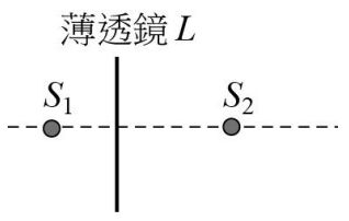 21. 兩個點光源 S1、S2間的距離為 24 cm,使用焦距為 9 cm 的薄透鏡 L,垂直放置於兩點光源 S1、S2的連線上並調整位置,如圖所示,使兩個點光源成像於同一位置,則兩點光源到透鏡的距離比為何?