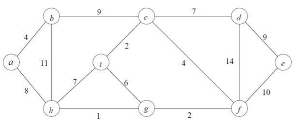 4. Prim 演算法的目的在於尋找最小生成樹 (minimum spanning tree),屢次找出不在樹上,離樹最近的點。如下圖,以 a 點當作起點,請問第 6 條加入樹中的邊為何者?請以 (頂點,頂點) 的數對表示。